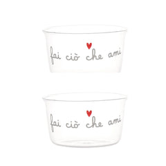 | Set 2 Coppette in Vetro Borosilicato Serigrafata - Fai ciò che Ami | Insalatiera in Grès Serigrafata - Una Patatina tira l'altra | Portamestoli in Grès - In Cucina |