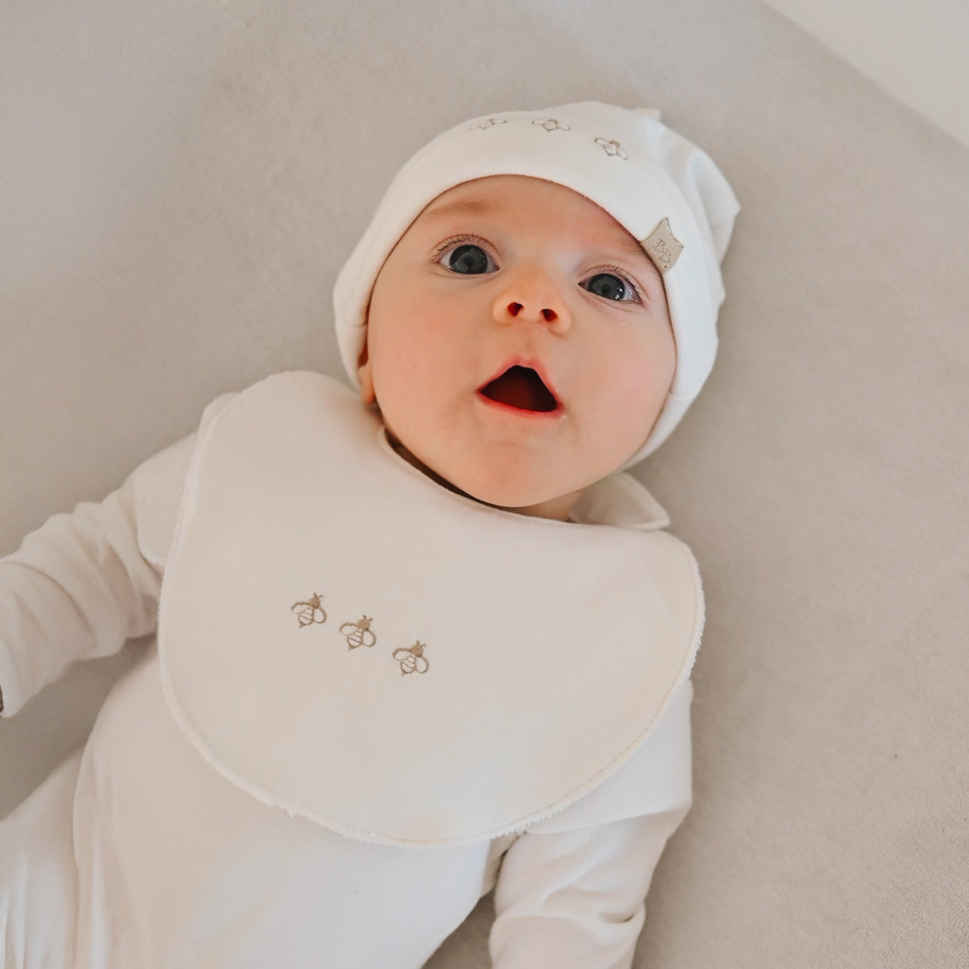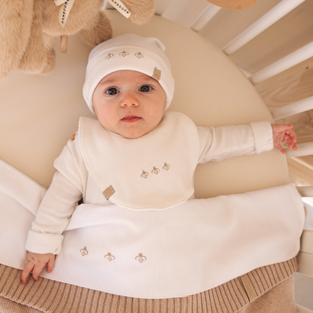 Il Bavaglino Bees è realizzato in morbida spugna di bambù organico, un materiale naturale e delicato che assicura comfort e protezione alla pelle sensibile del bebè. La sua forma circolare offre una copertura ottimale durante i pasti, mantenendo puliti i vestitini del bambino con massima dolcezza.