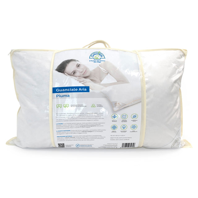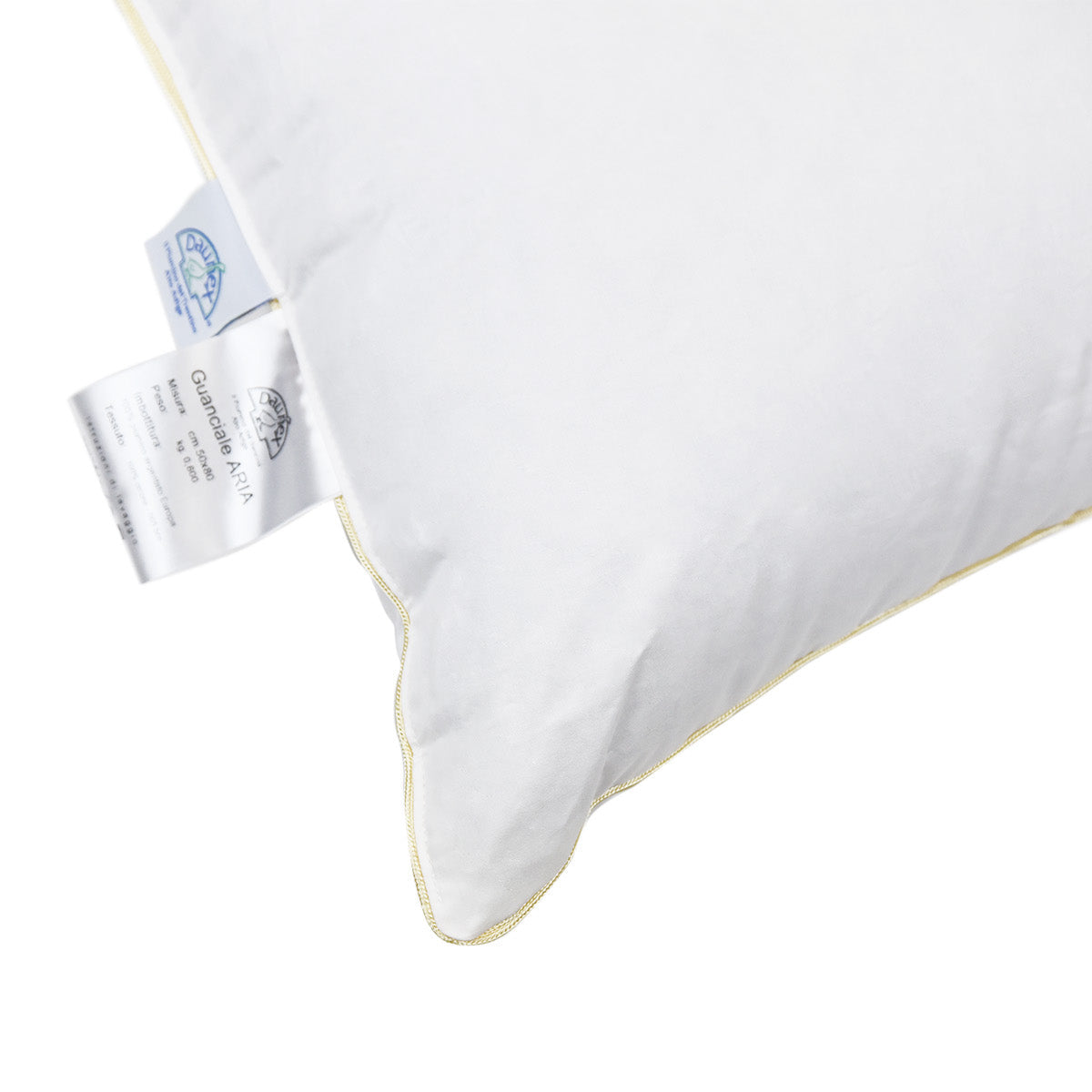 Morbido e confortevole Guanciale Aria in Piumino d'oca naturale 100%, ideale per dormire in pieno relax. Elegantemente rifinito con fettuccia perimetrale color oro, il guanciale è adatto a qualsiasi posizione e particolarmente indicato per chi dorme prono.