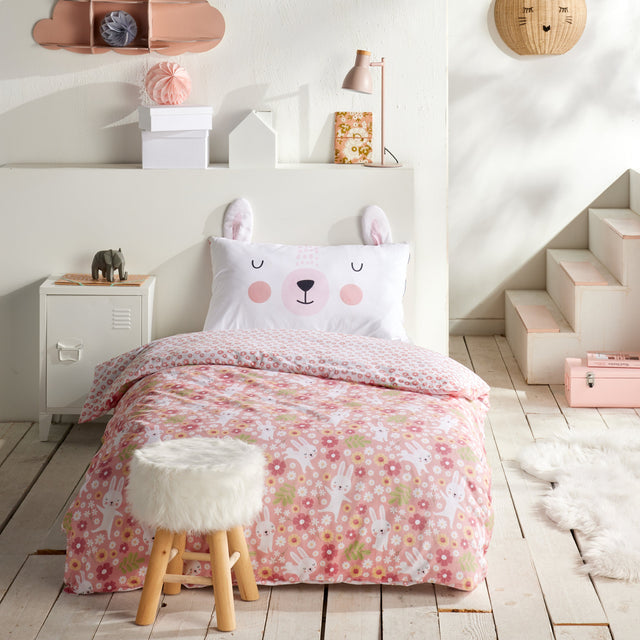 La Parure Copripiumino Janis per letto Singolo è realizzata in Puro Cotone. Sulla federa troviamo il design, minimale e simpatico, del musetto di un coniglio, mentre sul sacco troviamo una fantasia doubleface: da un lato, fiorellini rosa su fondo bianco, dall'altro, coniglietti bianchi e fiori colorati su sfondo rosa.
