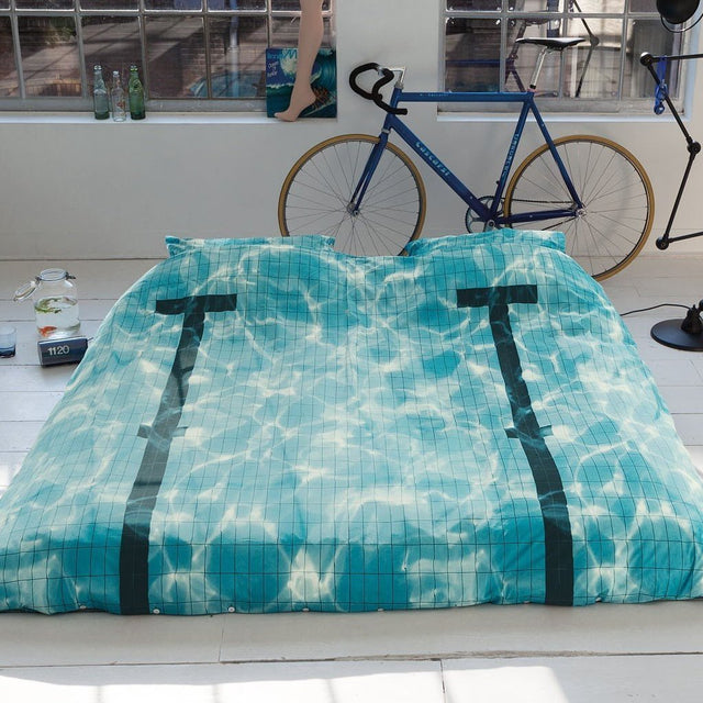 Piscina attraverso la sua fantastica stampa omaggia la bellezza e la profondità delle piscine olimpiche. Il fondale di una piscina caratterizza tutta la parure che grazie alla semplicità e alla finezza del cotone riesce ad esaltare l'alta definizione della stampa. Un perfetto prodotto da regalare ai grandi nuotatori.