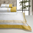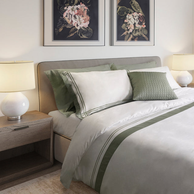 Il Completo Copripiumino Matrimoniale Londra è realizzato in Percalle di Cotone e caratterizzata una balza in raso colorata e due bacchette ricamate a contrasto lungo il bordo delle federe e la balza del sacco copripiumino, mentre il lenzuolo da sotto con angoli è tinta unita.