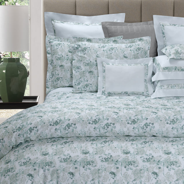 Carezza è una linea elegante e romantica, caratterizzata da una fantasia floreale che ritrae mazzolini di fiori di campo in tonalità fredde e polverose, a contrasto col fondo bianco del tessuto.