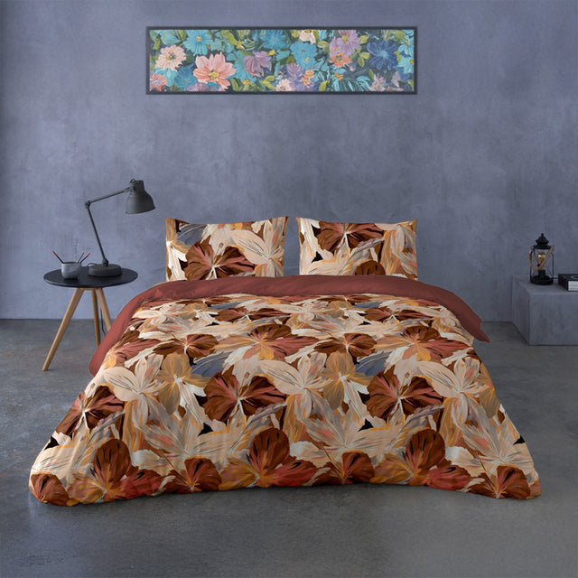La Parure Copripiumino Henna è realizzata in Percalle di Puro Cotone 200TC, un tessuto di alta qualità che unisce morbidezza, comfort e resistenza. La stampa, ricca e vibrante, raffigura ampie foglie dai toni caldi dell’henné, dell’ambra e del ruggine, illuminate da tocchi più chiari che creano un raffinato contrasto cromatico. Il lato inferiore in tinta unita richiama le sfumature più profonde della fantasia, per un effetto elegante e armonioso.