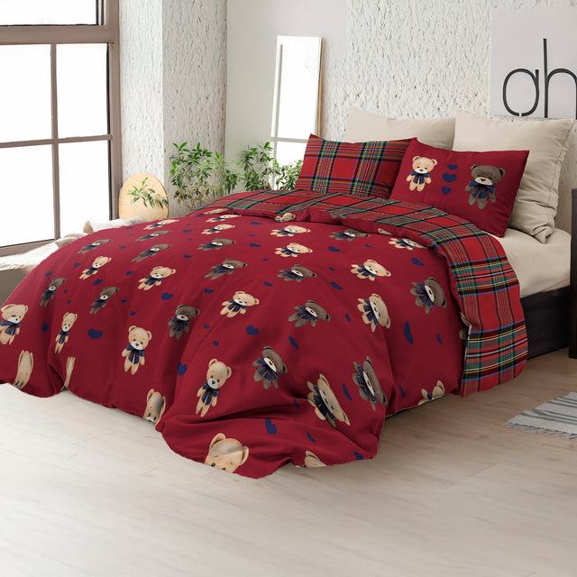 La Parure Copripiumino Orsacchiotti è realizzata in Puro Cotone. Dal tocco fresco e morbido, la parure è caratterizzata una fantasia doubleface: a tema tartan da un lato delle federe e del sacco copripiumino, l'altro lato ha un pattern di teneri orsacchiotti.