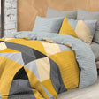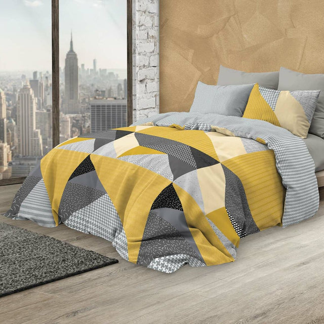 La collezione Astratto esplora il linguaggio geometrico contemporaneo attraverso un design essenziale di triangoli che si intersecano in pattern dinamici. Le combinazioni cromatiche bilanciano toni neutri come il grigio con accenti vivaci in giallo, rosa o grafite, creando un effetto visivo di movimento che trasforma la biancheria da letto in un elemento d'arredo distintivo, capace di valorizzare l'estetica moderna di qualsiasi camera.