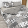 La Parure Copripiumino Petit Monte è realizzata in 100% Cotone. Dal tocco molto caldo e soffice, la parure è doubleface: su un lato delle federe e sul lenzuolo da sopra lo sfondo ha una fantasia patchwork, mentre sull'altro lato delle federe è tinta unita.