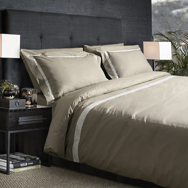 Il Completo Copripiumino Matrimoniale Corsica è realizzato in Percalle di Cotone 300TC, una lavorazione del tessuto di alta qualità, e caratterizzato da un bordino a contrasto sulla balza di federe e sacco copripiumino, mentre il lenzuolo da sotto con angoli è tinta unita.