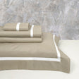 La collezione Corsica esalta la manifattura del percalle di cotone con tinte unite in tonalità moderne e delicate, che risaltano nel contrasto con il sottile bordino della balza.