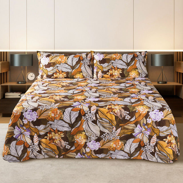 La Parure Copripiumino Sinaloa è realizzata in Percalle di Puro Cotone 200TC arricchita da una fantasia foliage tropicale sul lato superiore delle federe e del sacco copripiumino.