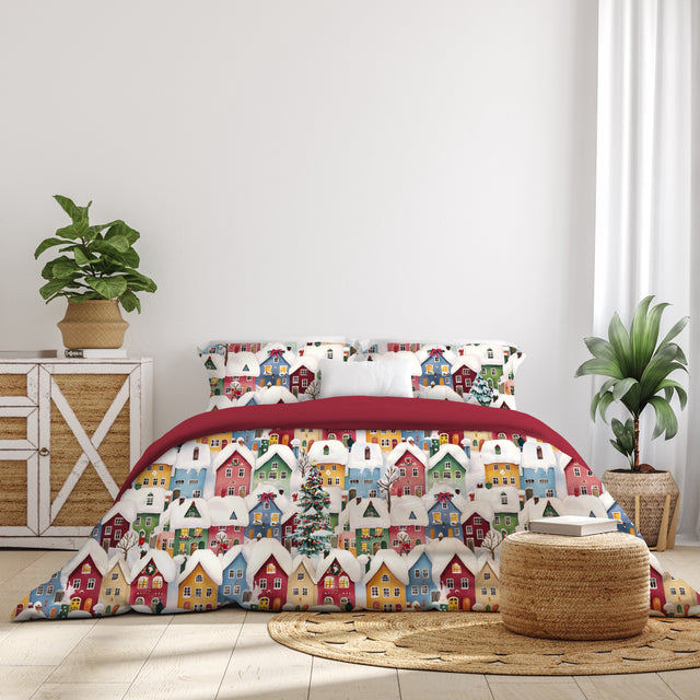 La Parure Copripiumino Casette è realizzata in Percalle di Puro Cotone 200TC, un tessuto naturale e traspirante che garantisce comfort e morbidezza in ogni stagione. La stampa vivace raffigura un villaggio innevato di casette colorate, creando un’atmosfera allegra e incantata che richiama la magia delle feste.