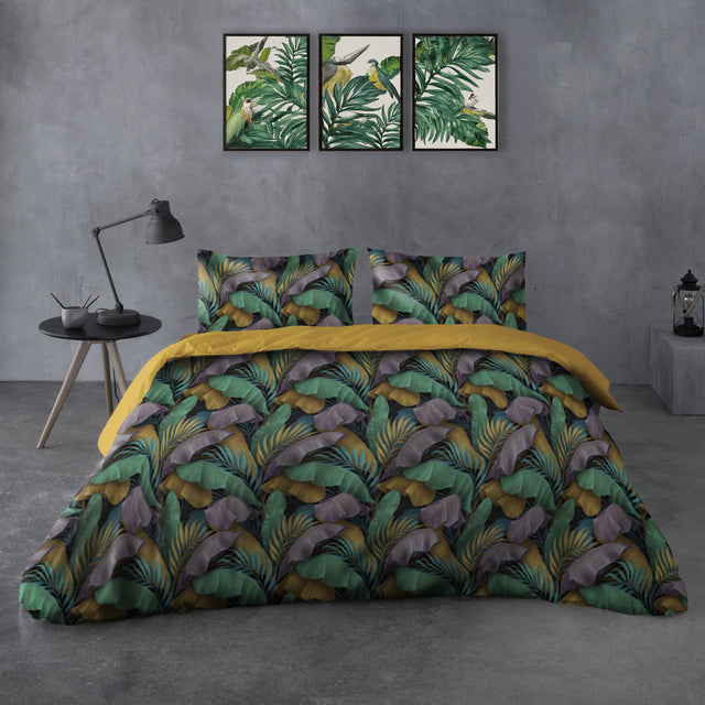 La Parure Copripiumino Jungle è realizzata in Percalle di Puro Cotone 200TC e si distingue per la sua vivace stampa tropicale, dove ampie foglie esotiche si intrecciano in un gioco di colori profondi e luminosi. Il lato superiore è decorato da una raffinata fantasia botanica ispirata alla giungla, mentre il lato inferiore in tinta unita crea un contrasto deciso che ne esalta la modernità.