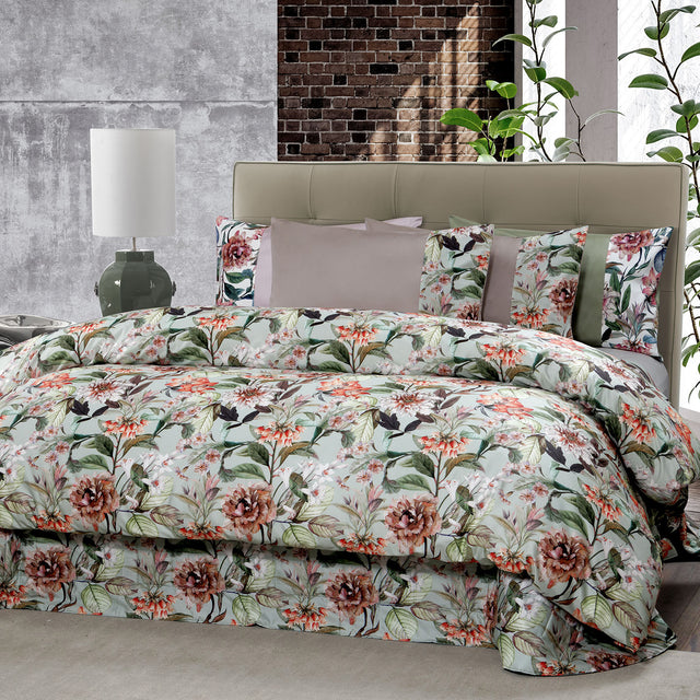 La Parure Copripiumino Dorset, realizzato in morbido Raso di Cotone 300 TC, è impreziosita da una fantasia floreale all over su federe e sacco copripiumino.