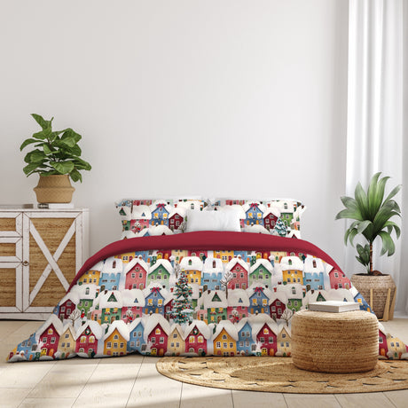 Parure Copripiumino in Percalle di Cotone con Stampa Villaggio Innevato - Casette