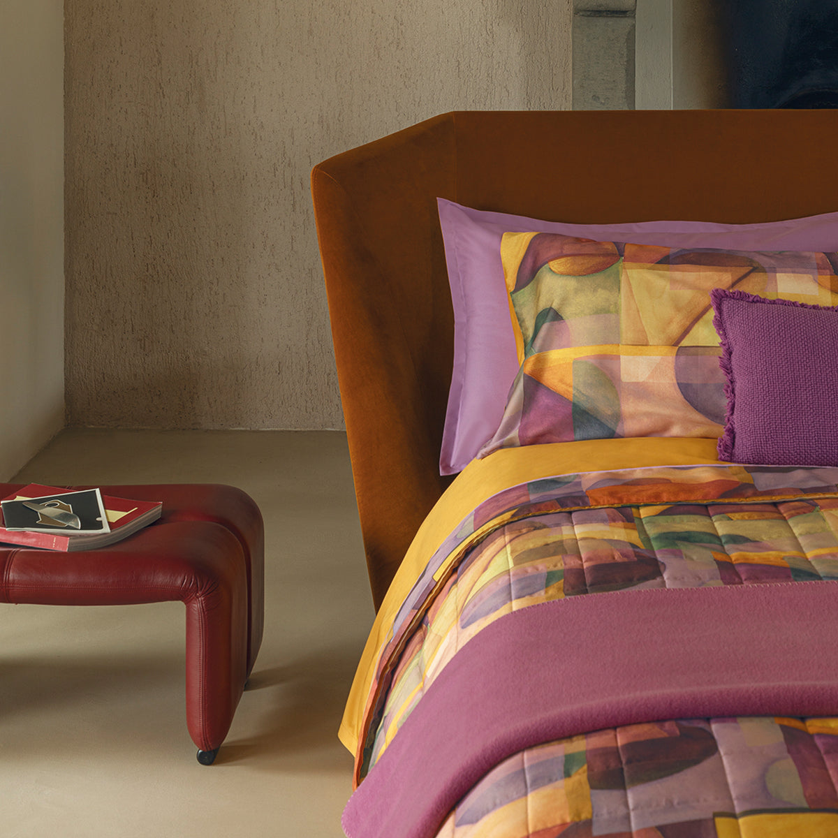 Il Completo Lenzuola Paracas è realizzato in percalle di puro cotone 200TC. Le federe e l’alta balza del lenzuolo da sopra, impreziosita da una codina a contrasto, presentano una stampa digitale geometrica dai colori intensi e sovrapposti. Il resto del completo, incluso il lenzuolo da sotto con angoli, è in percalle tinta unita.