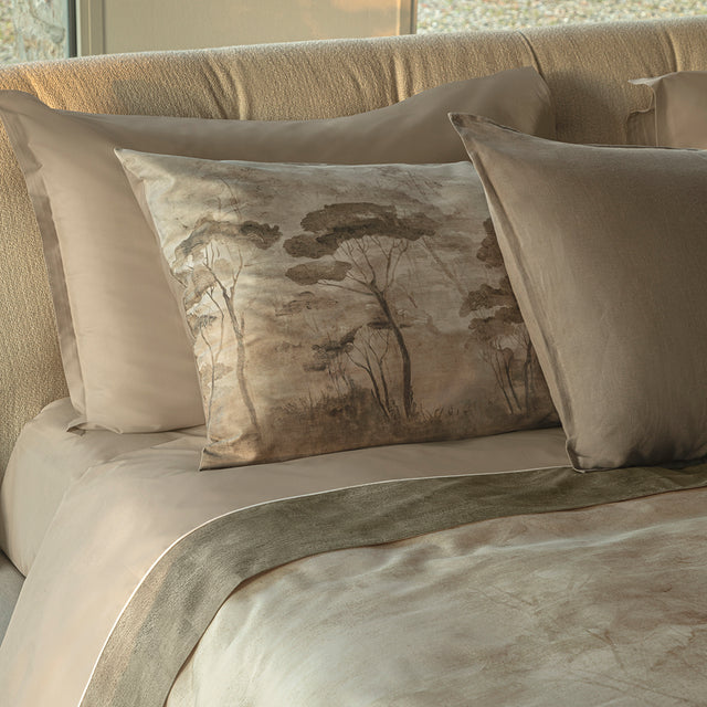 Il Completo Lenzuola Nemora è composto da federe e alta balza del lenzuolo in raso 300TC di puro cotone, decorate con una stampa digitale e rifinite da un bordino in nuance. Il resto del completo, incluso il lenzuolo da sotto con angoli, è in percalle di puro cotone tinta unita.