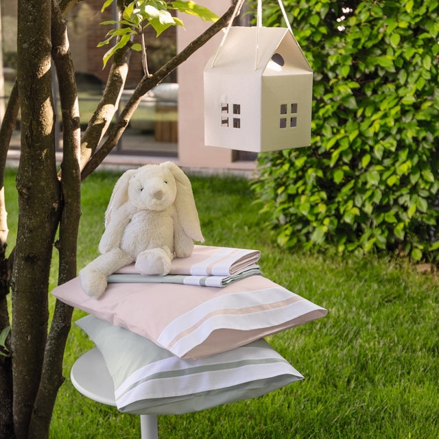Il Completo Lenzuoline per Culla e Lettino Nala è realizzato in 100% percalle di cotone, un tessuto fresco, morbido e traspirante ideale per il riposo dei più piccoli.