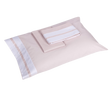 L’importante balza del lenzuolo e della federa è costruita con tre bordi applicati a mano, dettaglio sartoriale che dona eleganza e raffinatezza al corredo.