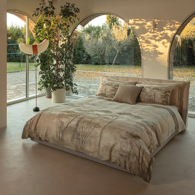 La Collezione Nemora nasce dalle atmosfere mitologiche dei boschi incantati, popolati da ninfe e spiriti sacri. Il disegno, animato da una texture lieve e vibrante, si distende con armonia su tutto il copripiumino e sull’imbottito, per poi riaffiorare delicatamente nella balza del lenzuolo. Una proposta avvolgente e suggestiva, che celebra il legame profondo con la natura e trasforma la camera da letto in un luogo sospeso tra sogno, mistero e leggenda.