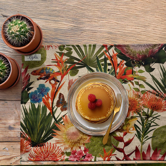 La tovaglietta in stile americano Laguna è realizzata in puro cotone e caratterizzata da una fantasia fantasia dalle splendide tonalità vivaci ed estive.