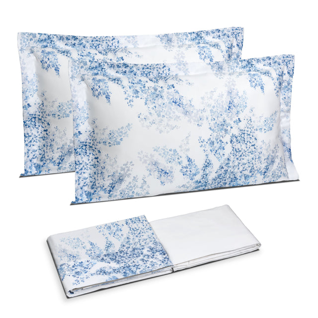 Il Completo Lenzuola Copriletto Glicine è realizzato in Raso di puro cotone. Incredibilmente leggero e fresco al tocco, il completo è caratterizzato da una stampa floreale all over, ovvero tutto stampa presente su entrambi i lati del lenzuolo, questa caratteristica rende il lenzuolo perfetto anche come copriletto per le stagioni più calde. Le federe hanno anch'esse con una stampa all over, mentre il lenzuolo di sotto con angoli è tinta unita.