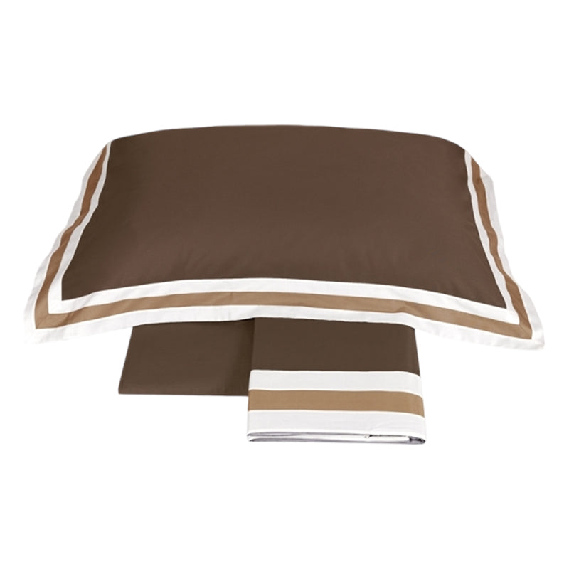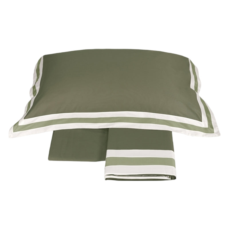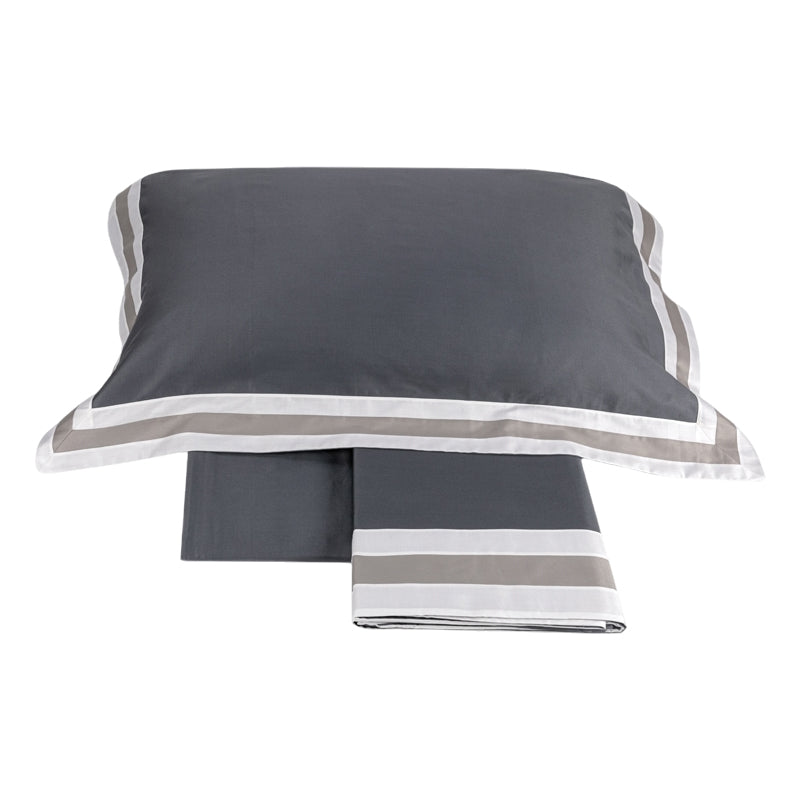 Il Completo Lenzuola Sentieri è realizzato in Raso 300 TC di puro cotone tinto con finissaggio Silk e Dream. Il lenzuolo di sotto con angoli tinta unita accompagna il lenzuolo di sopra, anch'esso monocromatico, ma arricchito da una balza composta da tre bordini che alternano le tonalità caratteristiche della versione colore. Seguendo lo stesso principio di abbinamenti tono su tono, le federe sono incorniciate da volant sui quattro lati, composti da tre bordini a colori alternati.