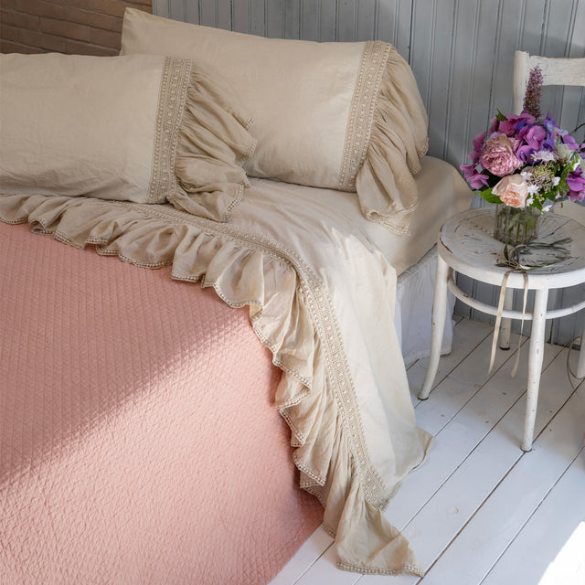 Il Completo Lenzuola Matrimoniale Camille è realizzato in Cotone Stonewashed No Stiro e caratterizzato da una galetta no stiro: una rouches e un intarsio in pizzo che impreziosiscono tutto il perimetro delle federe e del lenzuolo da sopra. Il lenzuolo da sotto con angoli e in 100% cotone tinta unita.