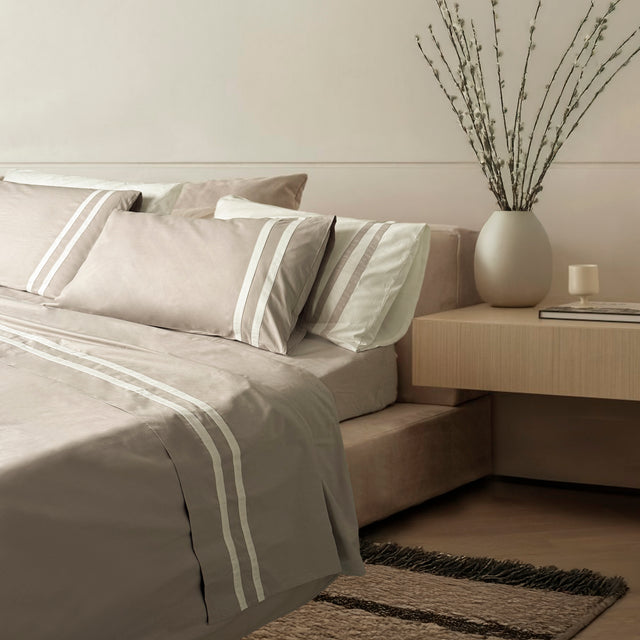 La collezione Bretagne è caratterizzata da un doppio bordino a contrasto sulla balza e dalle nuance naturale e polverose che tingono i capi di questa linea, donando a letto un look moderno ed elegante.