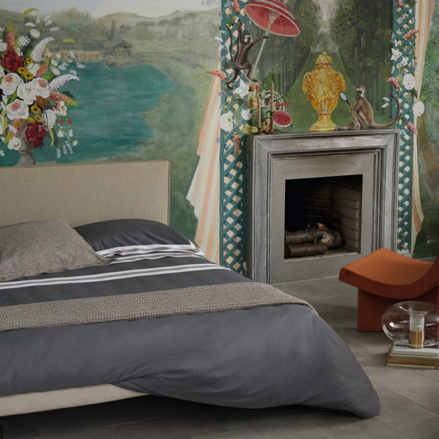 Il Completo Lenzuola Sentieri è realizzato in Raso 300 TC di puro cotone tinto con finissaggio Silk e Dream. Il lenzuolo di sotto con angoli tinta unita accompagna il lenzuolo di sopra, anch'esso monocromatico, ma arricchito da una balza composta da tre bordini che alternano le tonalità caratteristiche della versione colore. Seguendo lo stesso principio di abbinamenti tono su tono, le federe sono incorniciate da volant sui quattro lati, composti da tre bordini a colori alternati.