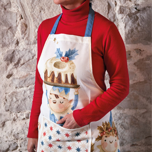 Il Grembiule Incanti di Maison Sucrée è realizzato in 100% cotone riciclato. La stampa digitale ad altissima risoluzione su fondo bianco caratterizza il Grembiule con una elegante fantasia di folletti e magia del Natale. Curato in ogni dettagli, con fettucce regolabili per indossarlo comodamente.