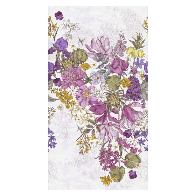 La collezione Dina cattura l'essenza di un giardino segreto in piena fioritura. Dalie vellutate si aprono in tutto il loro splendore, rivelando sfumature di fucsia intenso che dialogano con le tonalità dorate di crisantemi selvatici. Piccoli grappoli di fiori viola, simili a delicati lillà, punteggiano la composizione creando ritmo e movimento. Le foglie verdi aggiungono profondità e struttura a questa sinfonia botanica. Lo sfondo, simile a una nebbia mattutina, sfuma i contorni più distanti, suggerendo un mondo floreale che continua oltre i confini visibili.