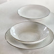 Ogni piatto presenta leggere differenze e piccole imperfezioni che lo rendono unico; la decorazione a spirale con effetto embossing, realizzata con tecnica Pad Printing, conferisce un tocco autentico e raffinato, perfetto per una tavola dallo stile contemporaneo.