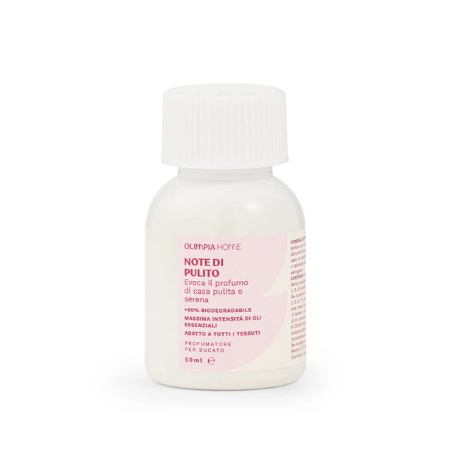 Il Profumatore Note di Pulito è una fragranza esclusiva di Olimpia Home pensata per rendere ogni lavaggio un gesto di freschezza quotidiana. Con soli 7 ml per lavaggio (un tappo), profuma intensamente i tuoi capi, lasciando una scia pulita, delicata e persistente. È compatibile con tutti i tessuti e si abbina perfettamente ad ammorbidenti neutri, per una personalizzazione completa della fragranza.