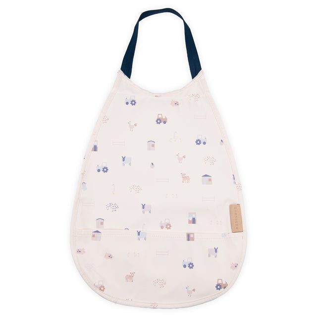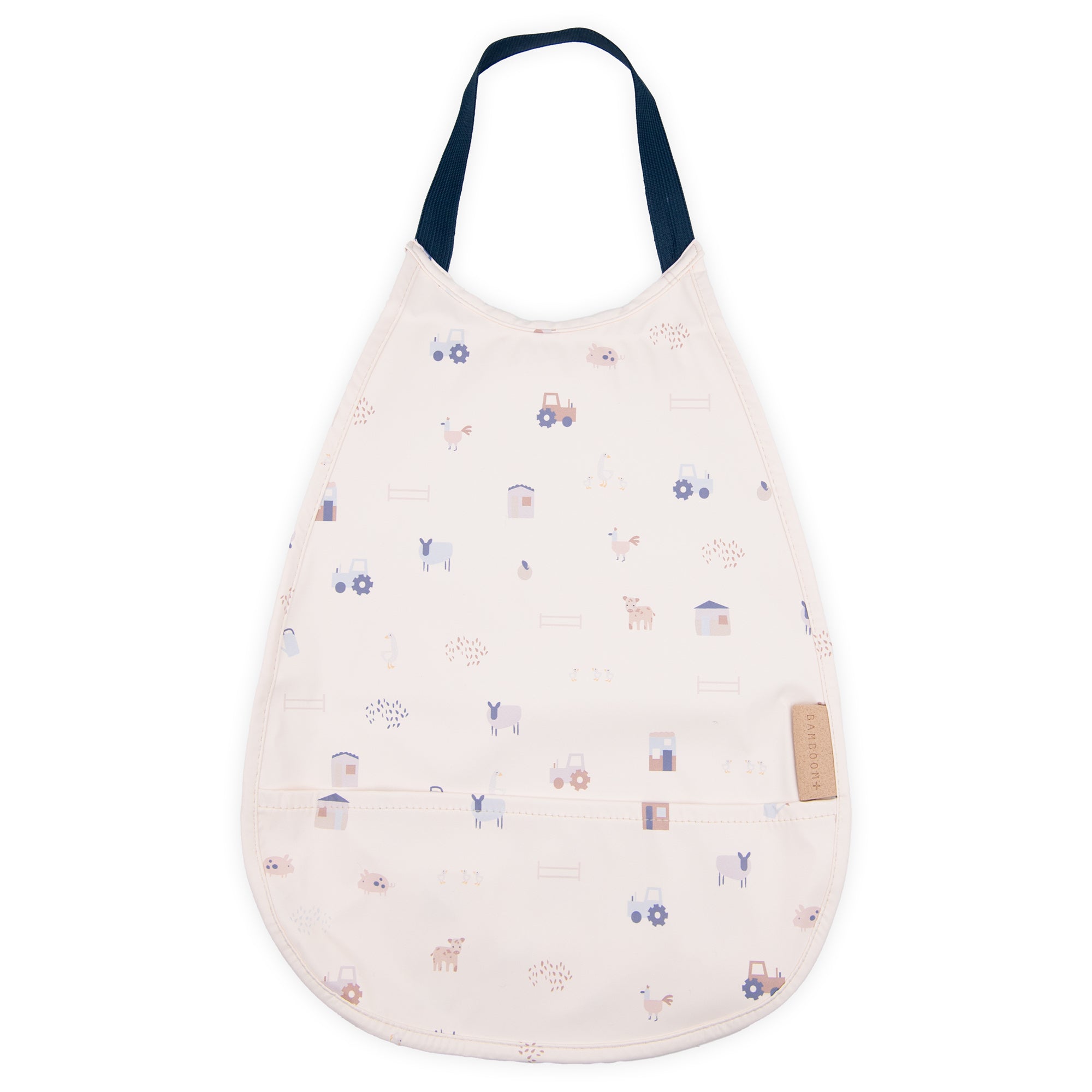 La chiusura regolabile dietro al collo assicura una vestibilità comoda e si adatta facilmente alla crescita del bambino. Il design con fantasia a tema fattoria dona un tocco allegro e divertente, rendendo il momento del pasto più piacevole e senza pensieri.