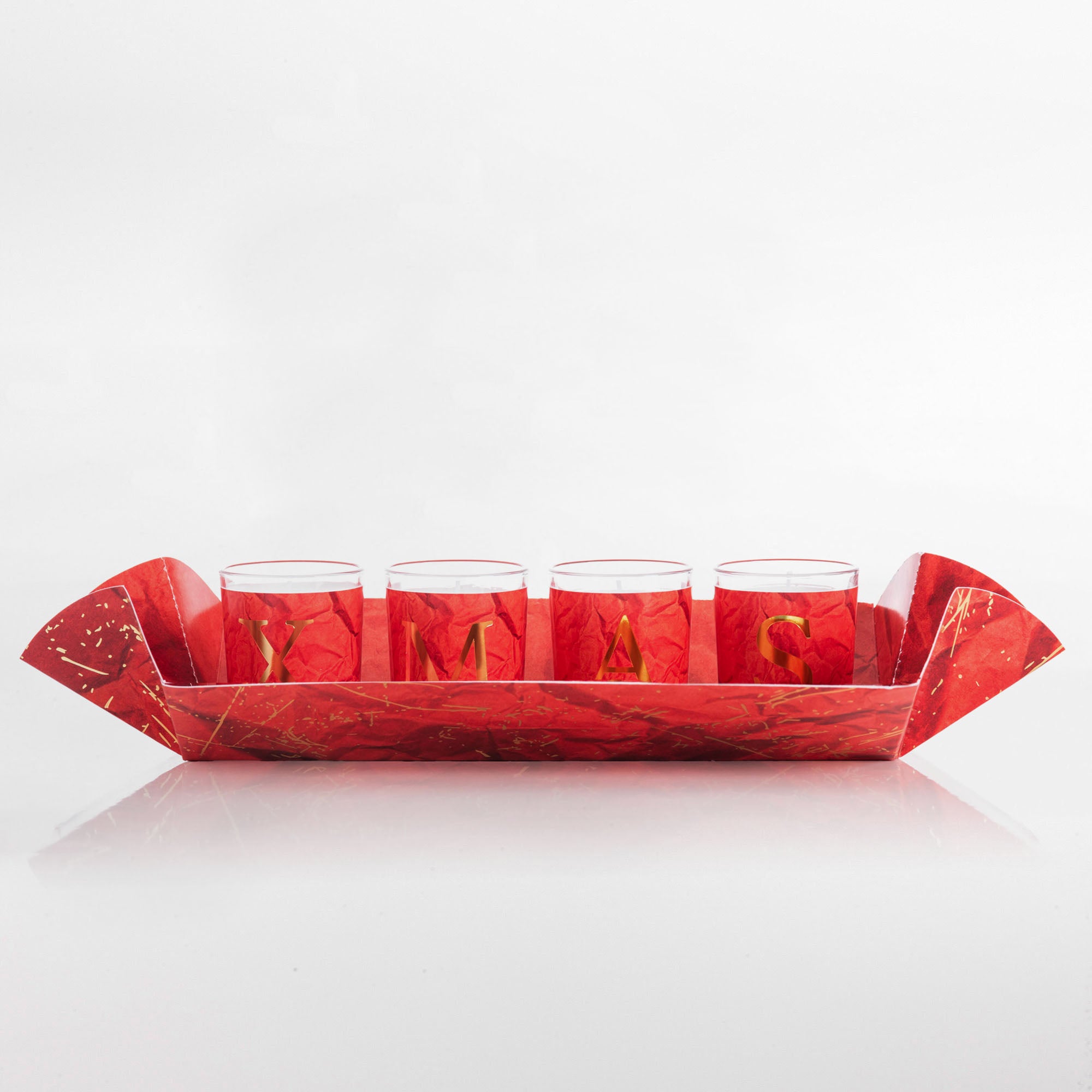 Ogni candela è contenuta in un elegante bicchiere in vetro con le lettere dorate X – M – A – S.
