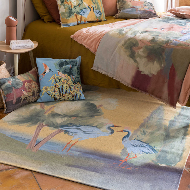 Il Tappeto Arredo Lola trasforma ogni ambiente con il suo poetico design ispirato alla natura e alla grazia degli uccelli. Realizzato in 100% poliestere a tessitura piatta, questo raffinato tappeto fabbricato in Europa porta un tocco di eleganza unica ai tuoi spazi. Il suo affascinante paesaggio palustre dipinto con tratti acquerellati risalta per i dettagli e l'accostamento di colori intensi e speziati.