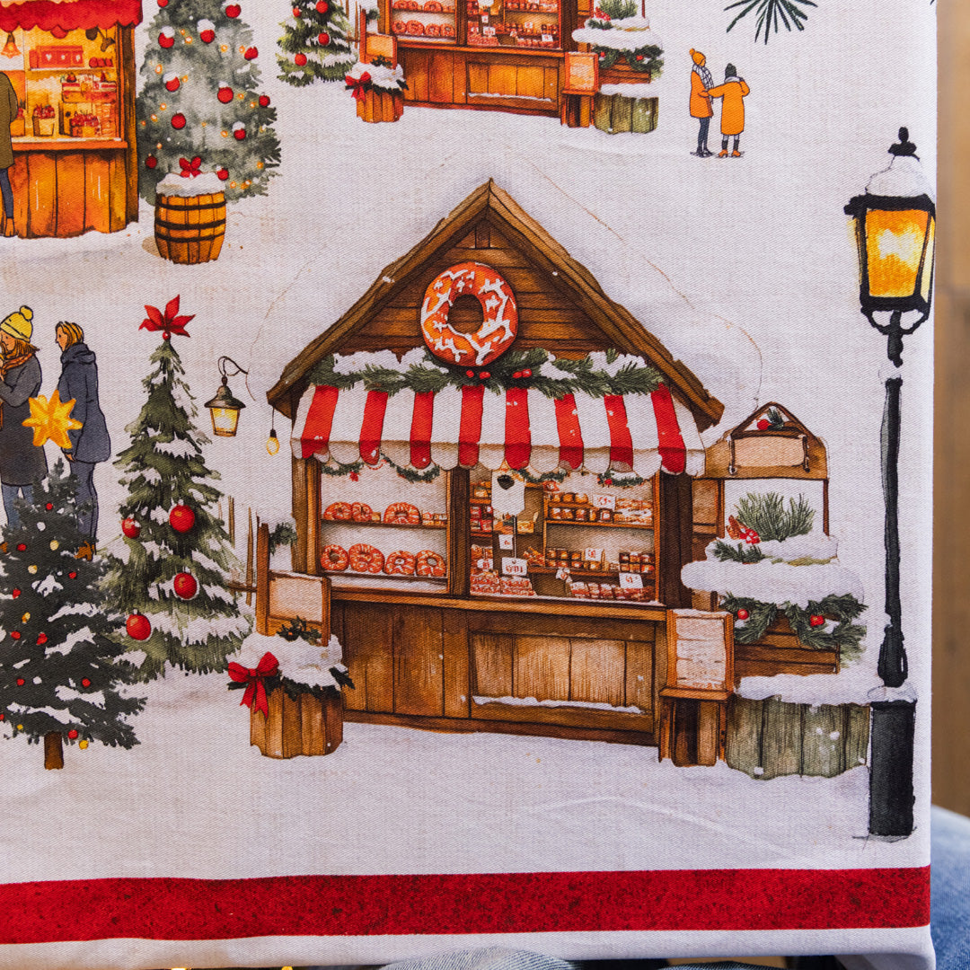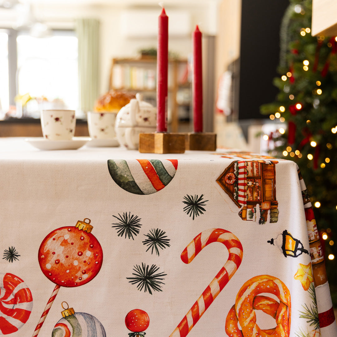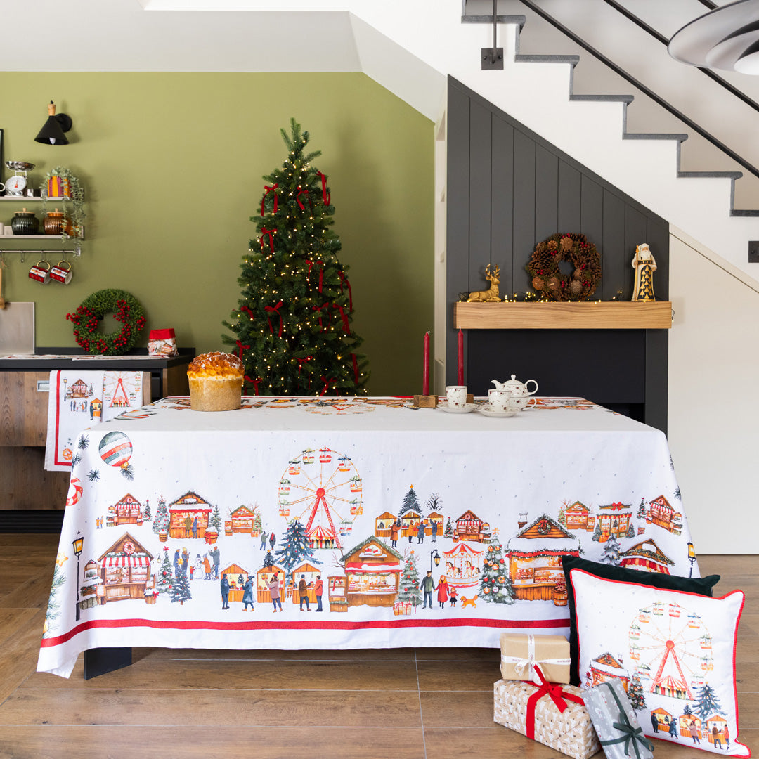 La Tovaglia Christmas Village è interamente realizzata in Puro Cotone. La sua vivace stampa digitale porta in tavola l’atmosfera incantata dei mercatini di Natale, tra casette di legno, luci scintillanti e dettagli che raccontano tutta la magia delle feste.