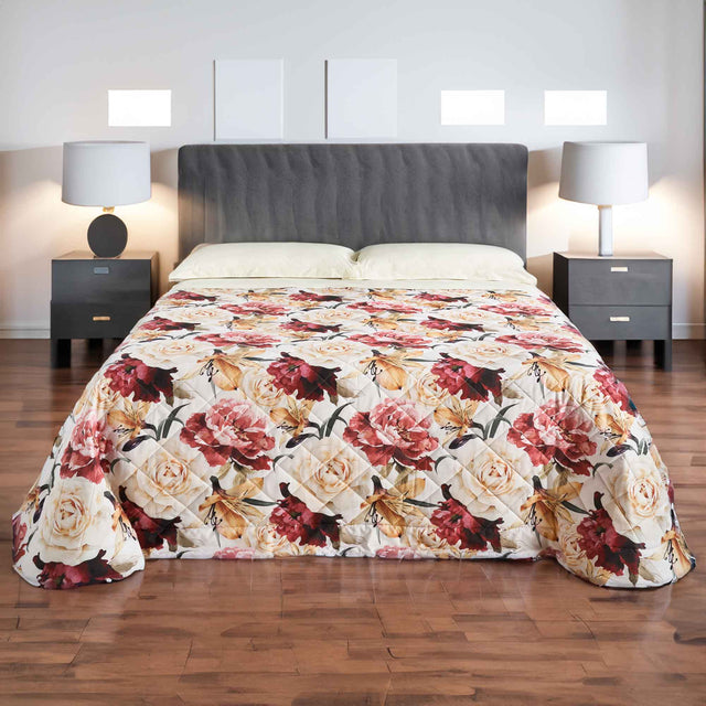 Il Trapuntino Giverny è realizzato in Percalle di Cotone 200TC e arricchito da una meravigliosa Fantasia Floreale.