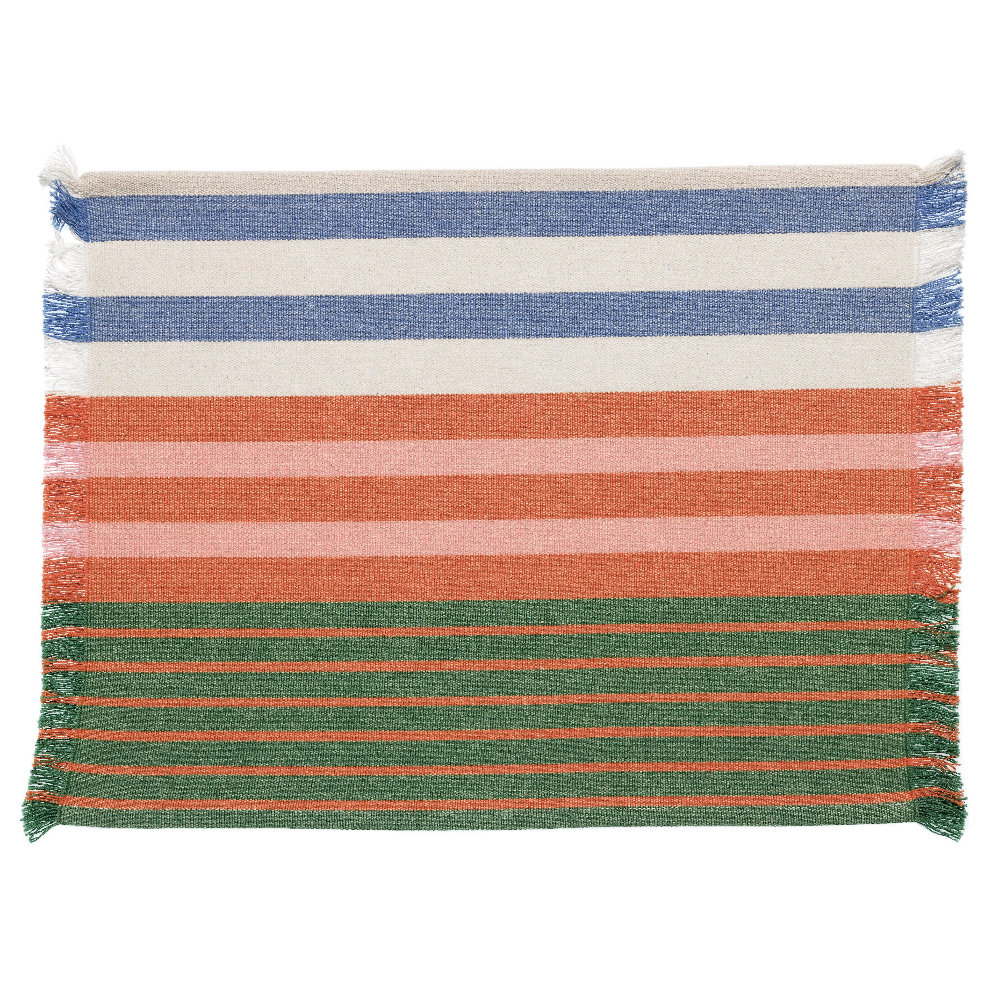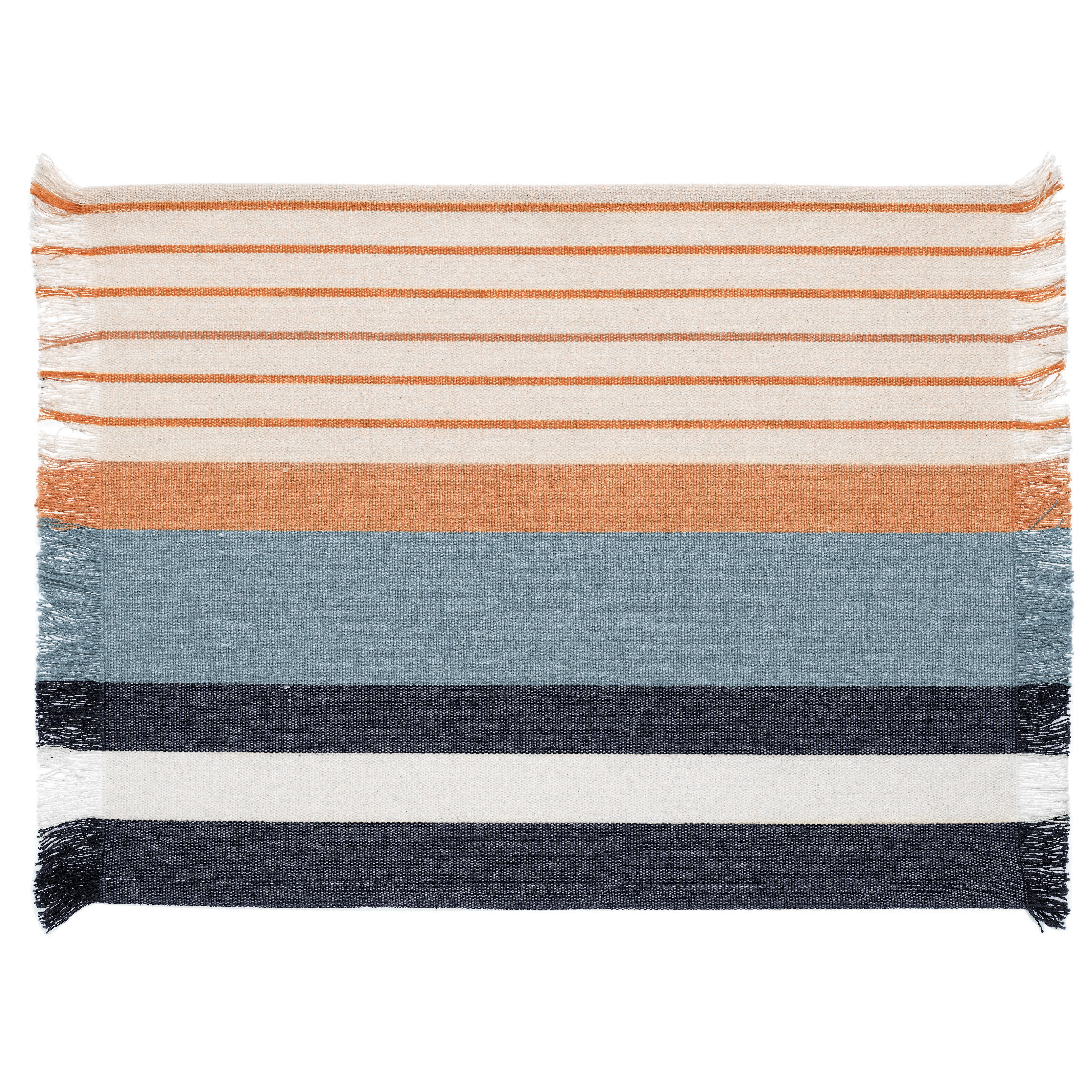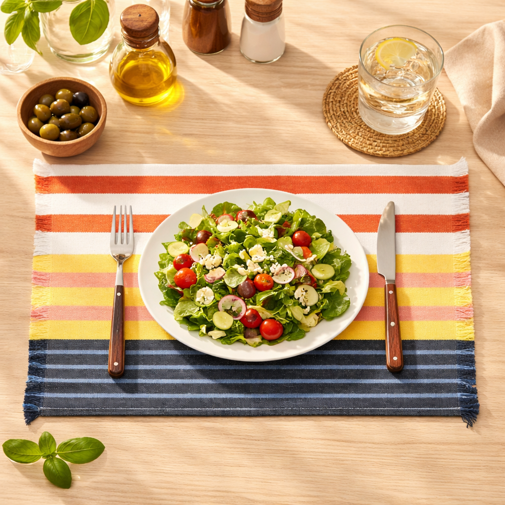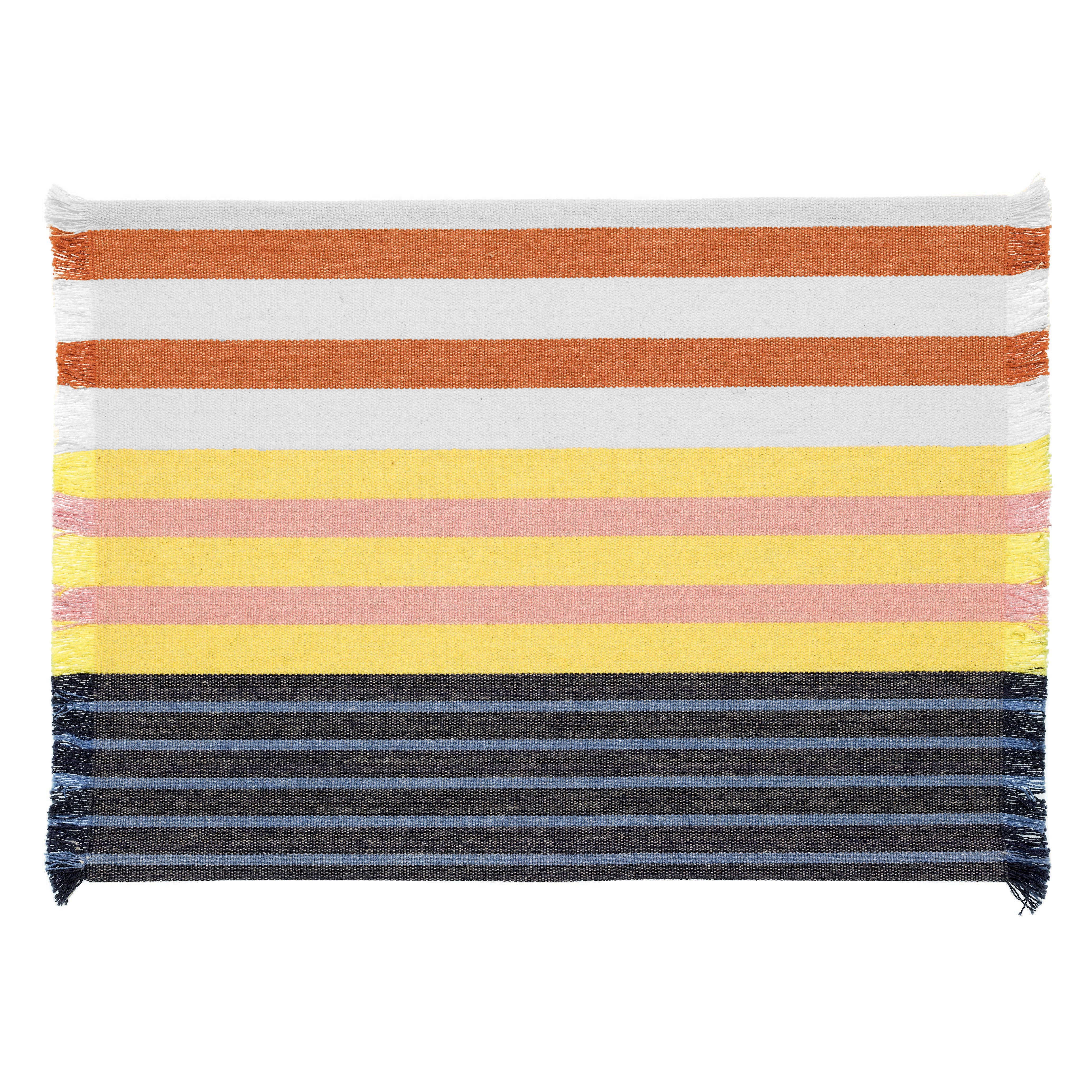 L’Americano Yuna è realizzato in 100% cotone riciclato con una tessitura corposa (380 g/m²): la trama consistente lo rende piacevole e stabile sulla tavola, mentre il motivo a righe multicolor dona un tocco allegro e contemporaneo, perfetto per apparecchiare con personalità tutti i giorni.