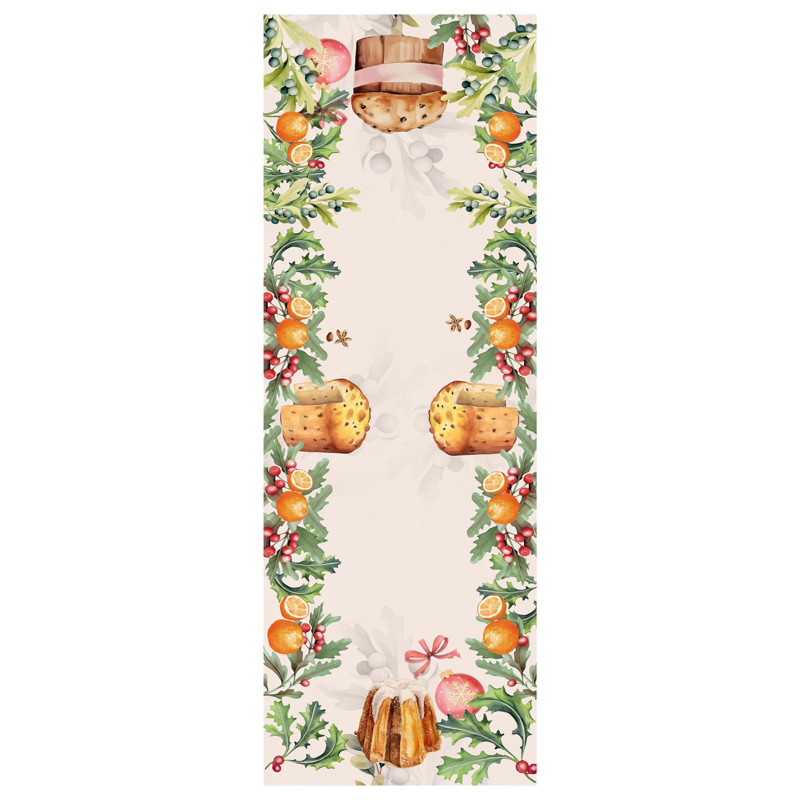 Il Runner Tavola Italiana è interamente realizzato in Puro Cotone. La sua raffinata stampa digitale ricrea sulla tavola l'atmosfera magica della Vigilia di Natale, con i suoi dolci iconici come pandoro e panettone, in una celebrazione della tradizione italiana. L'elegante orlo semplice da 2,5 cm conferisce al runner una finitura pulita e raffinata.