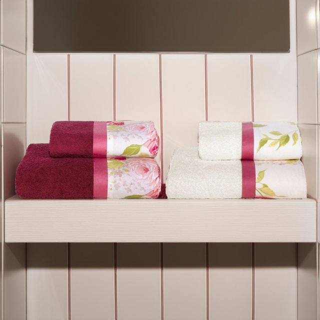 Set di asciugamani in Spugna di Puro Cotone, arricchito da una balza in raso con Fantasia Floreale. La Spugna, con una corposità di 430 gr/mq, è estremamente soffice e piacevole al tatto e garantisce un'incredibile capacità di assorbimento.
